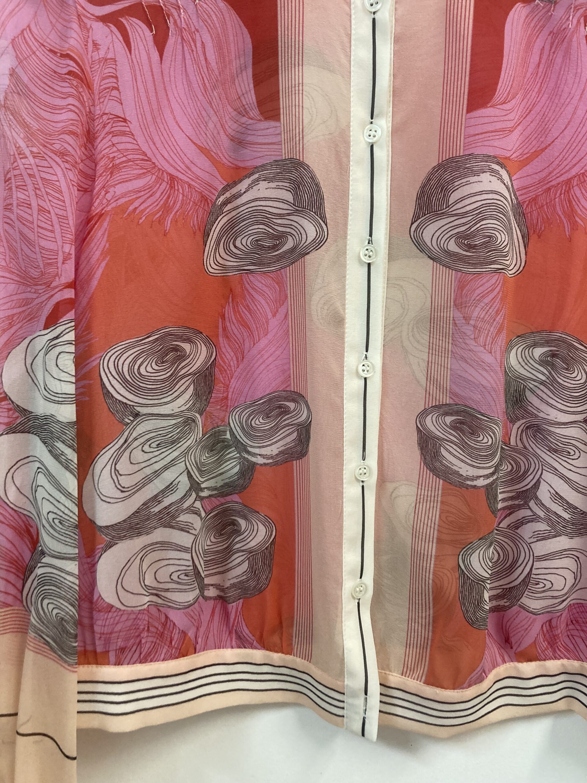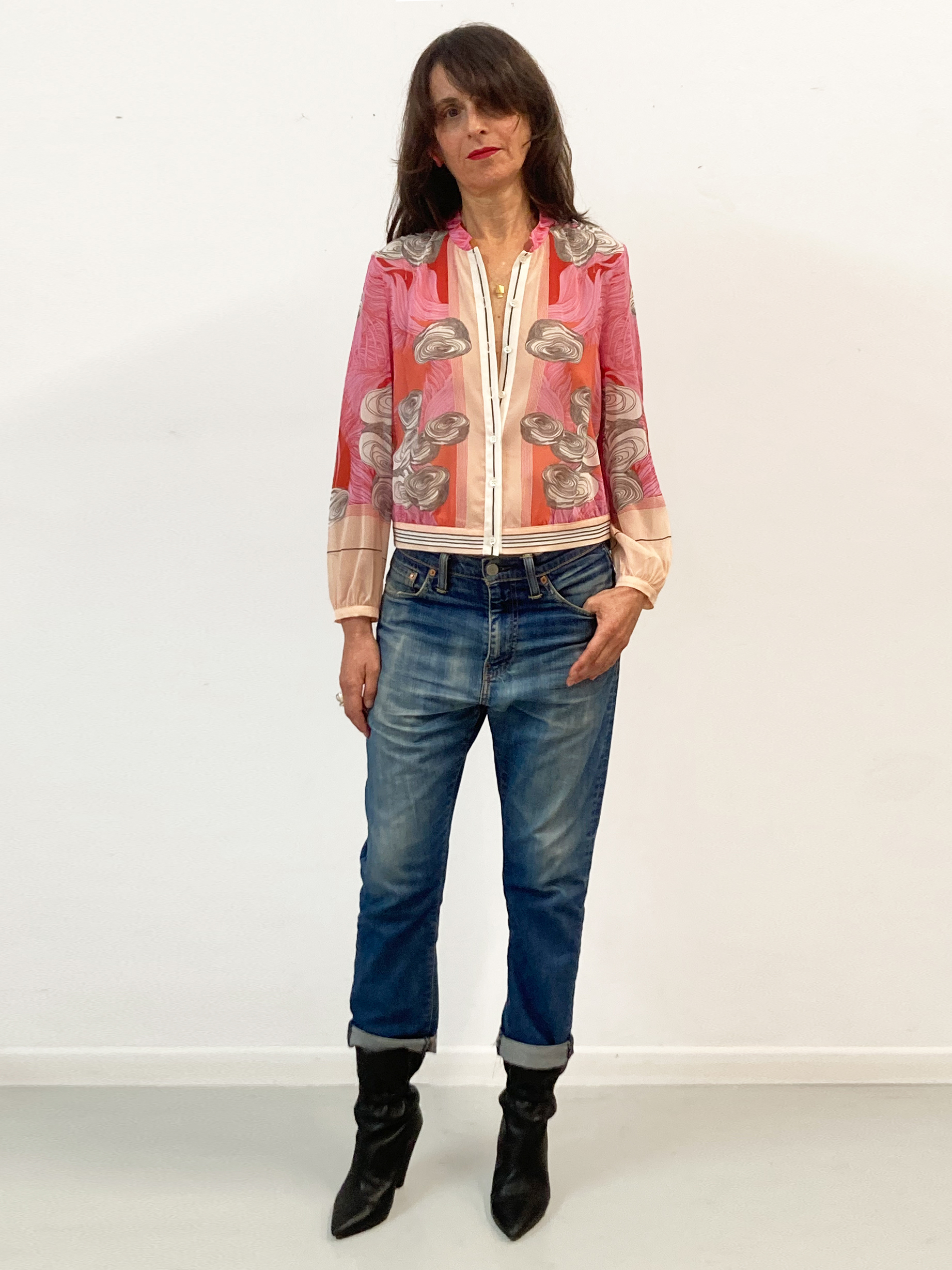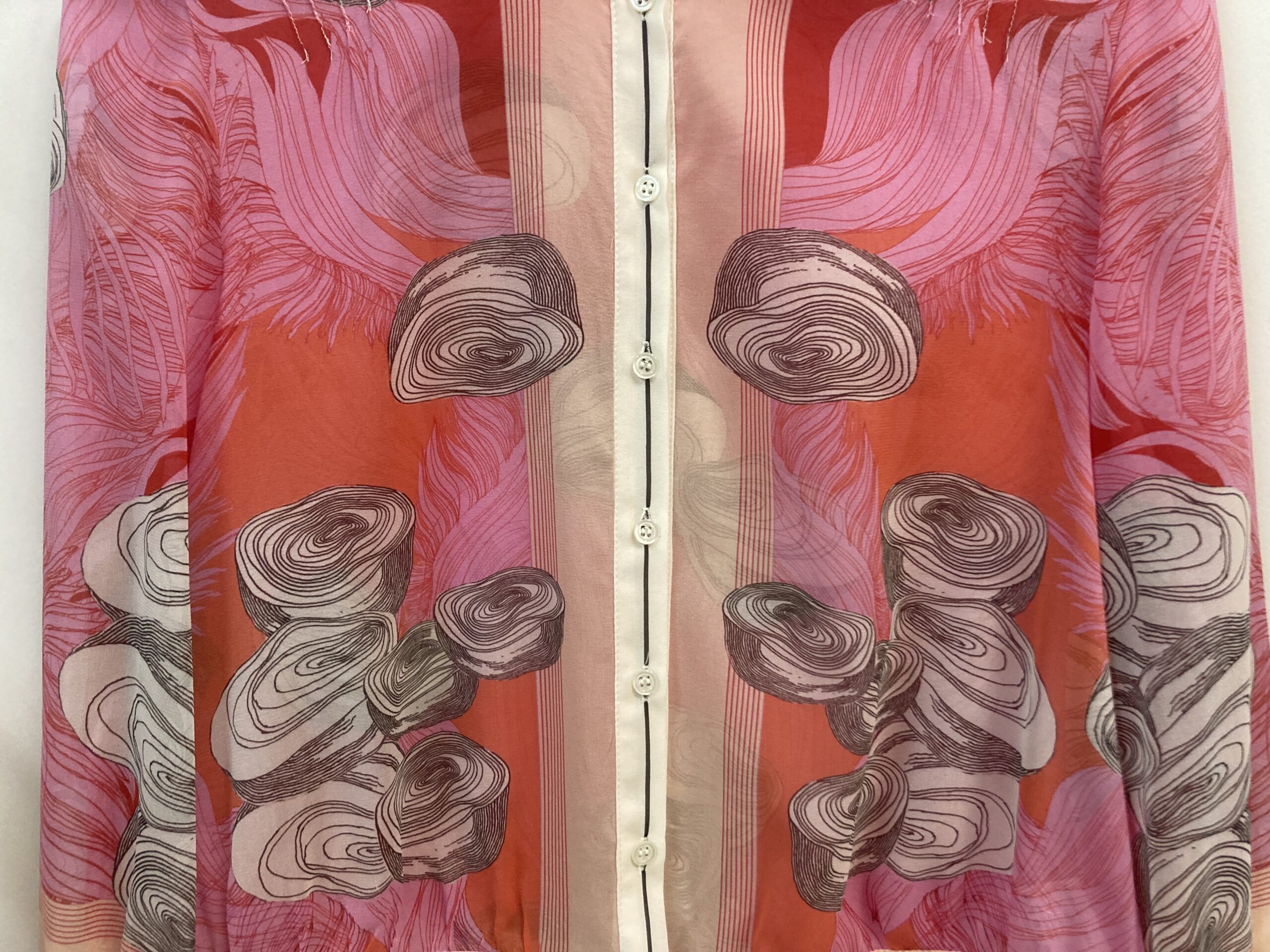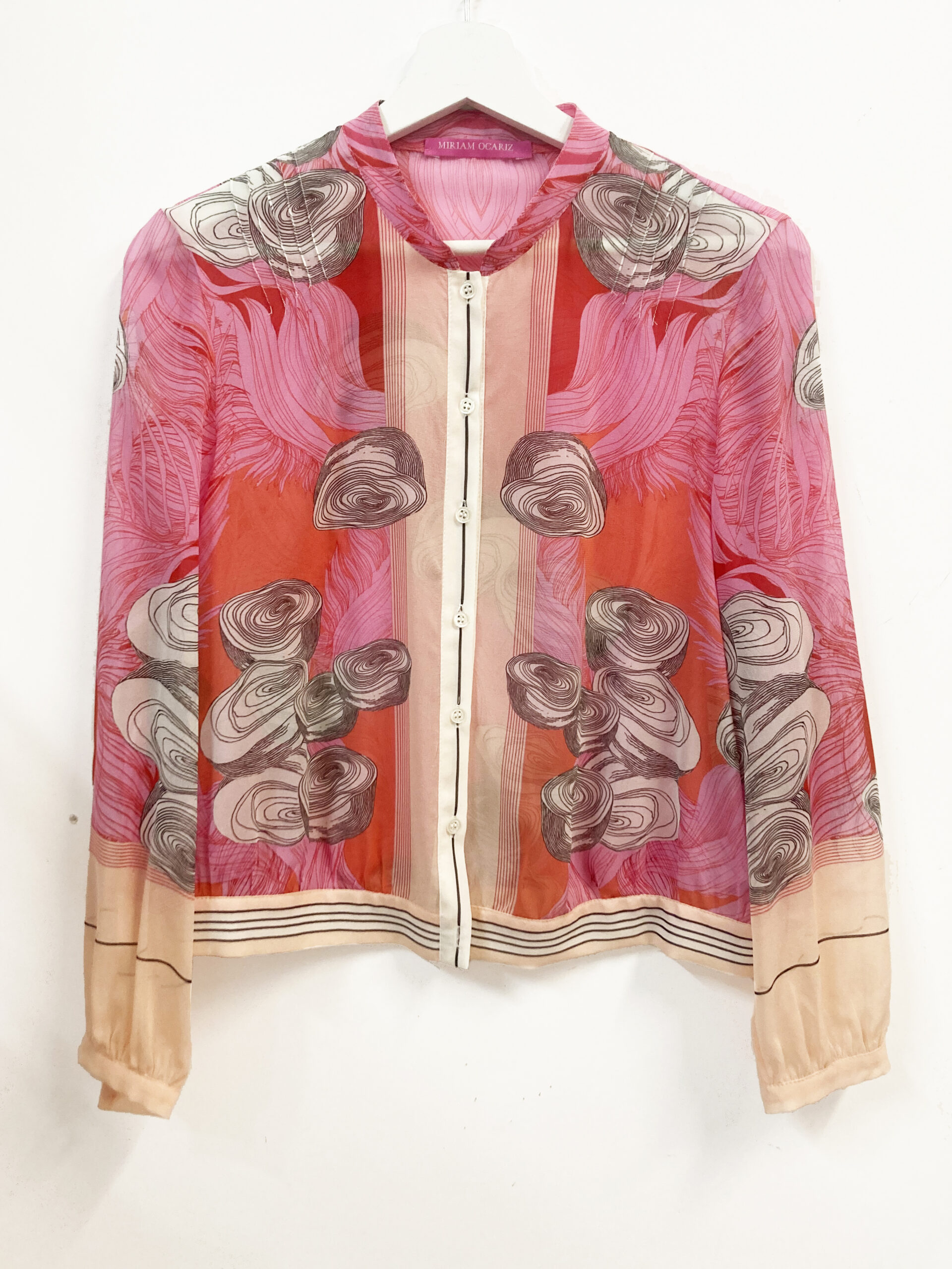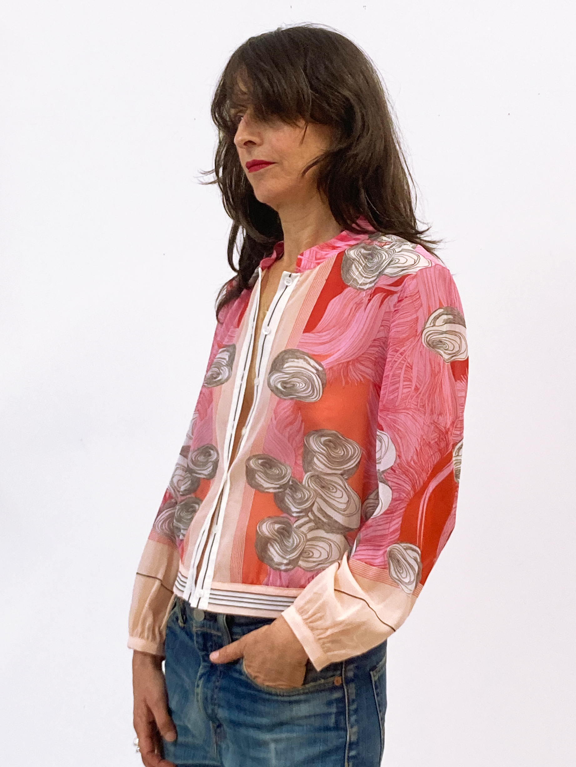 Made from a very soft and lightweight silk stretch georgette, it gives it a formal and delicate look. Its elasticity also makes it practical and durable. It’s a versatile garment that can be worn as a shirt or as a light jacket.